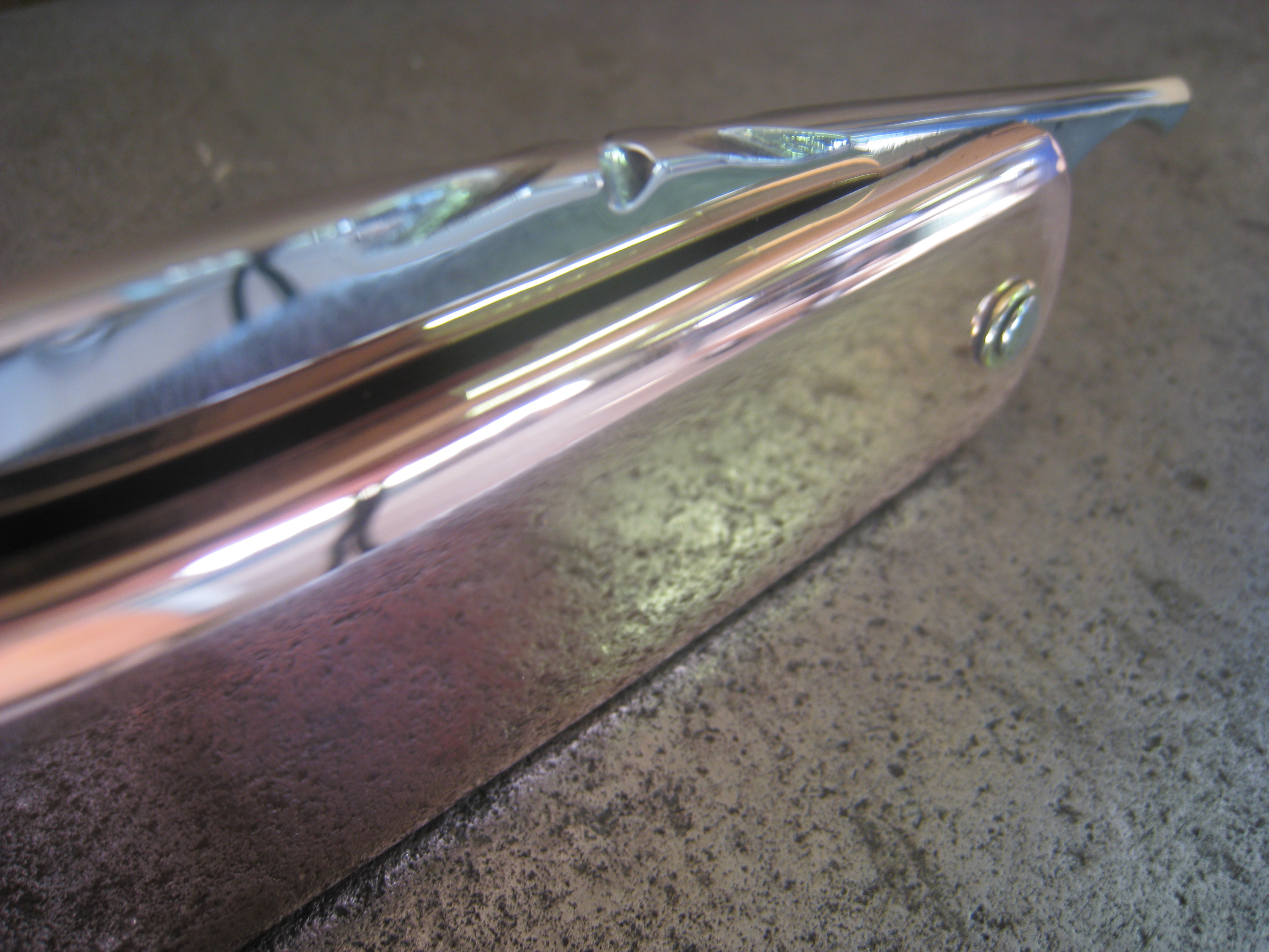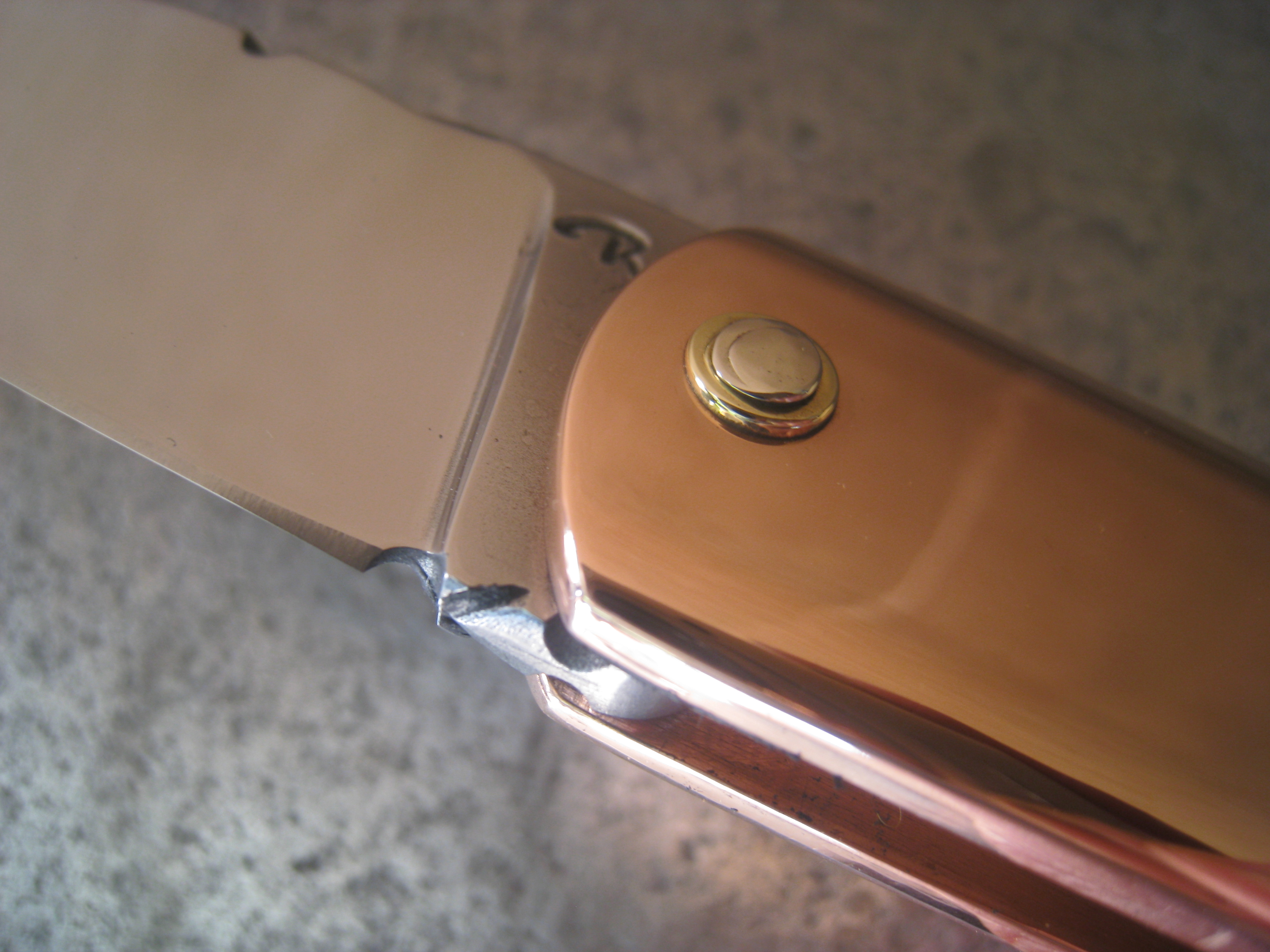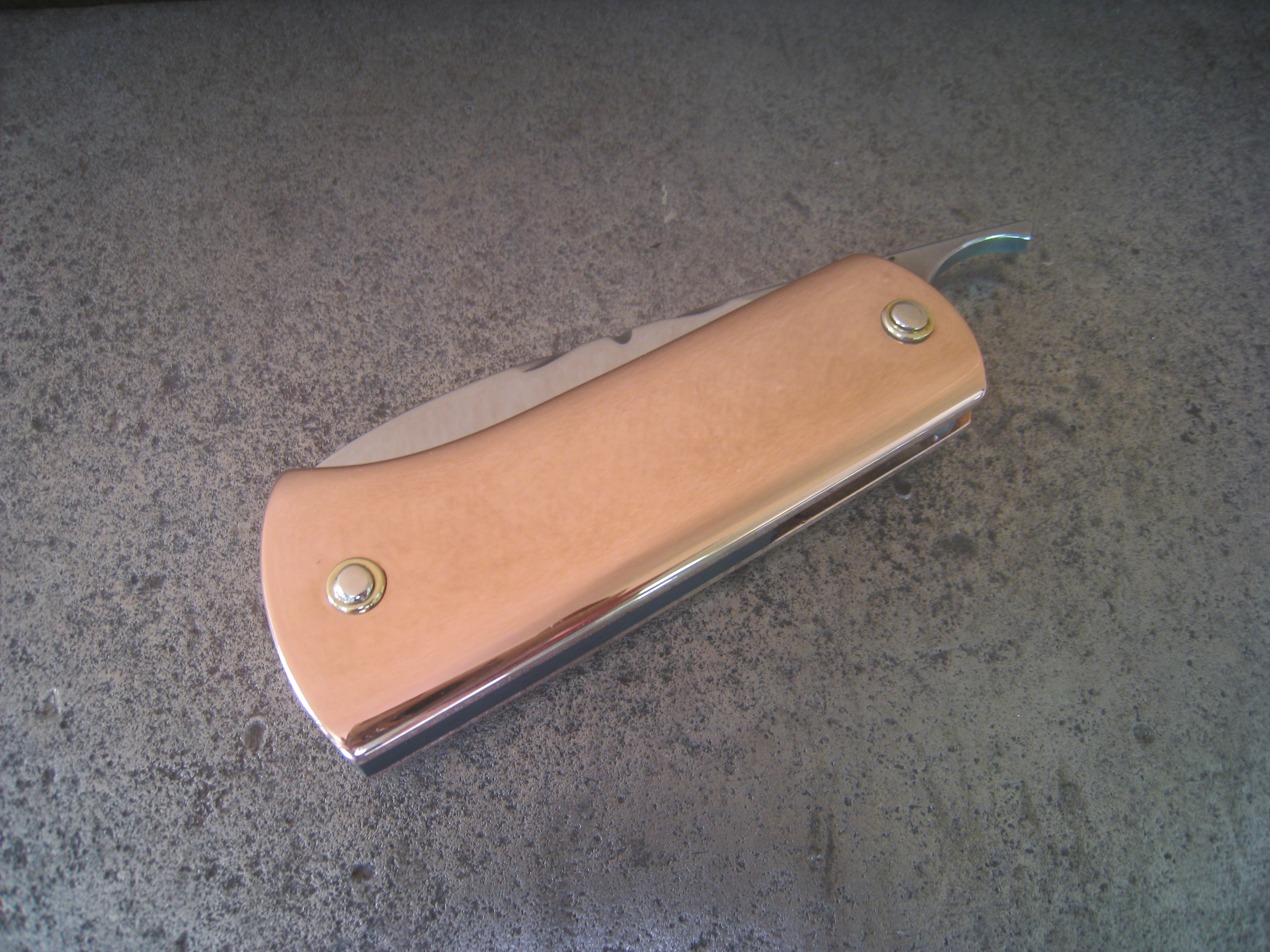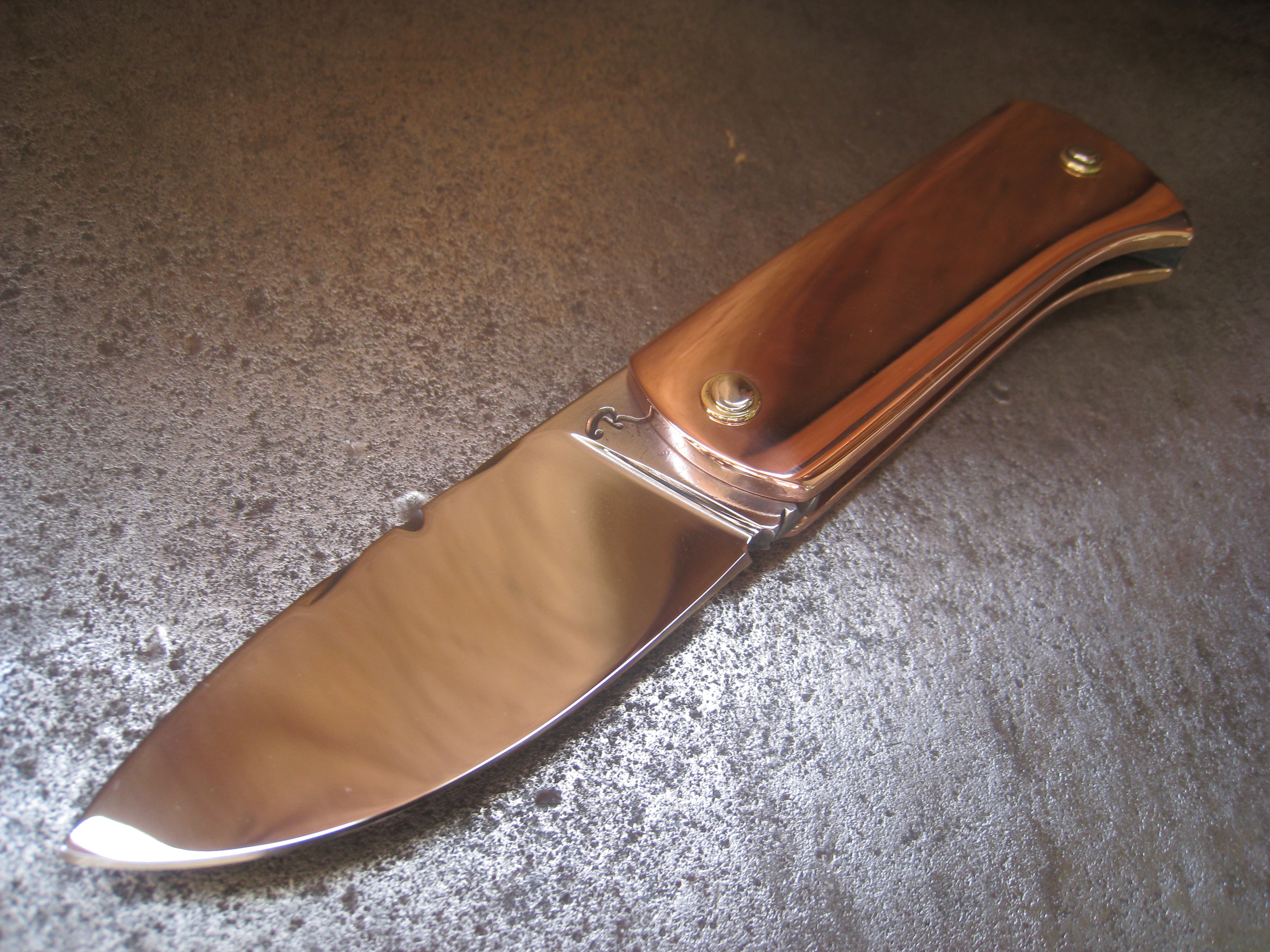 Piémontais avec plaquettes en cuivre et lame xc75 polie miroir. Réservé.