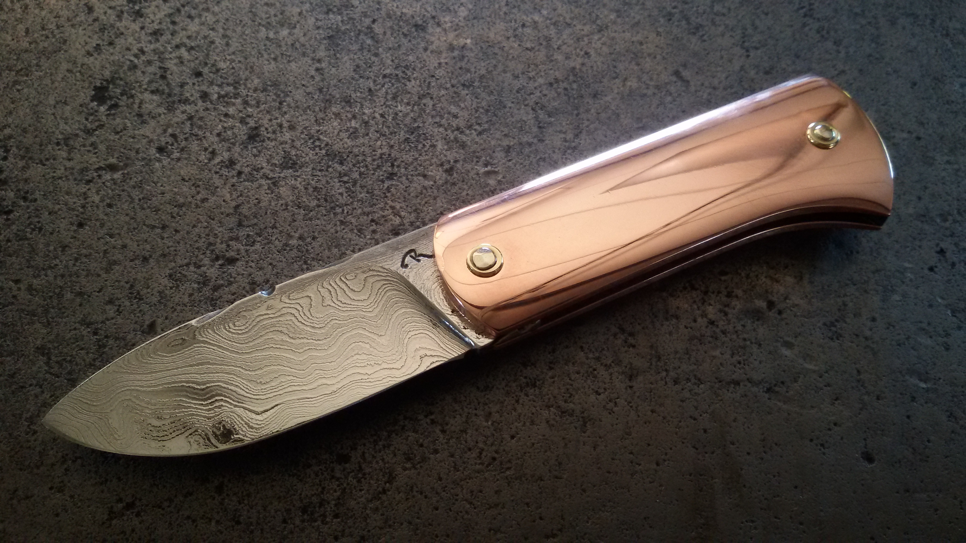 Piémontais manche cuivre et lame damas. (Damas Thierry Desnoix).