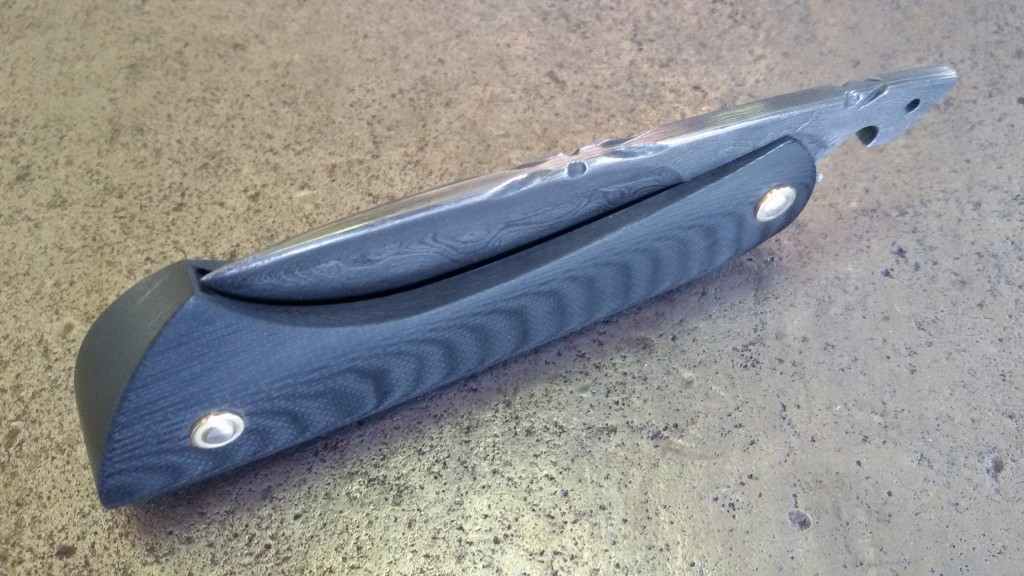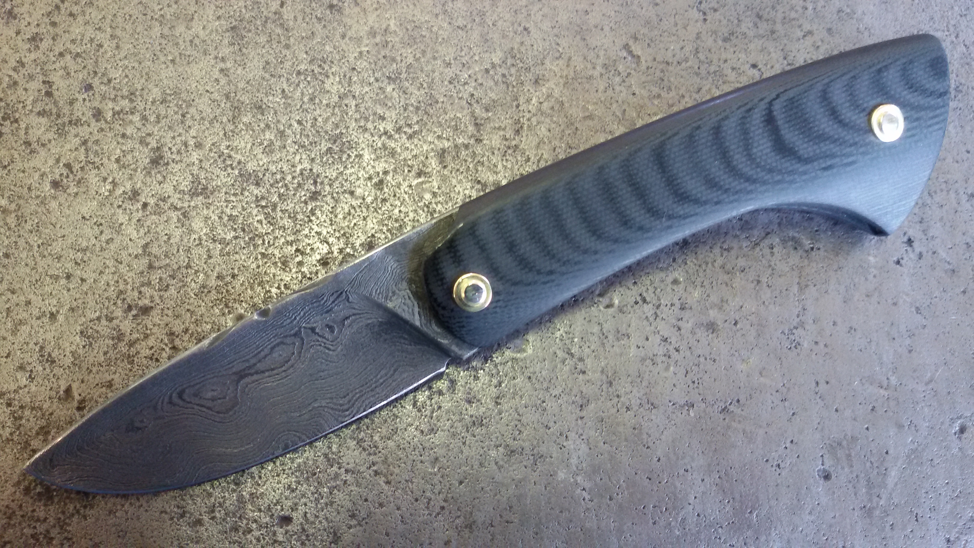Requin Mousse avec manche G10 noir et lame en damas de chez Thierry Desnoix. Vendu.