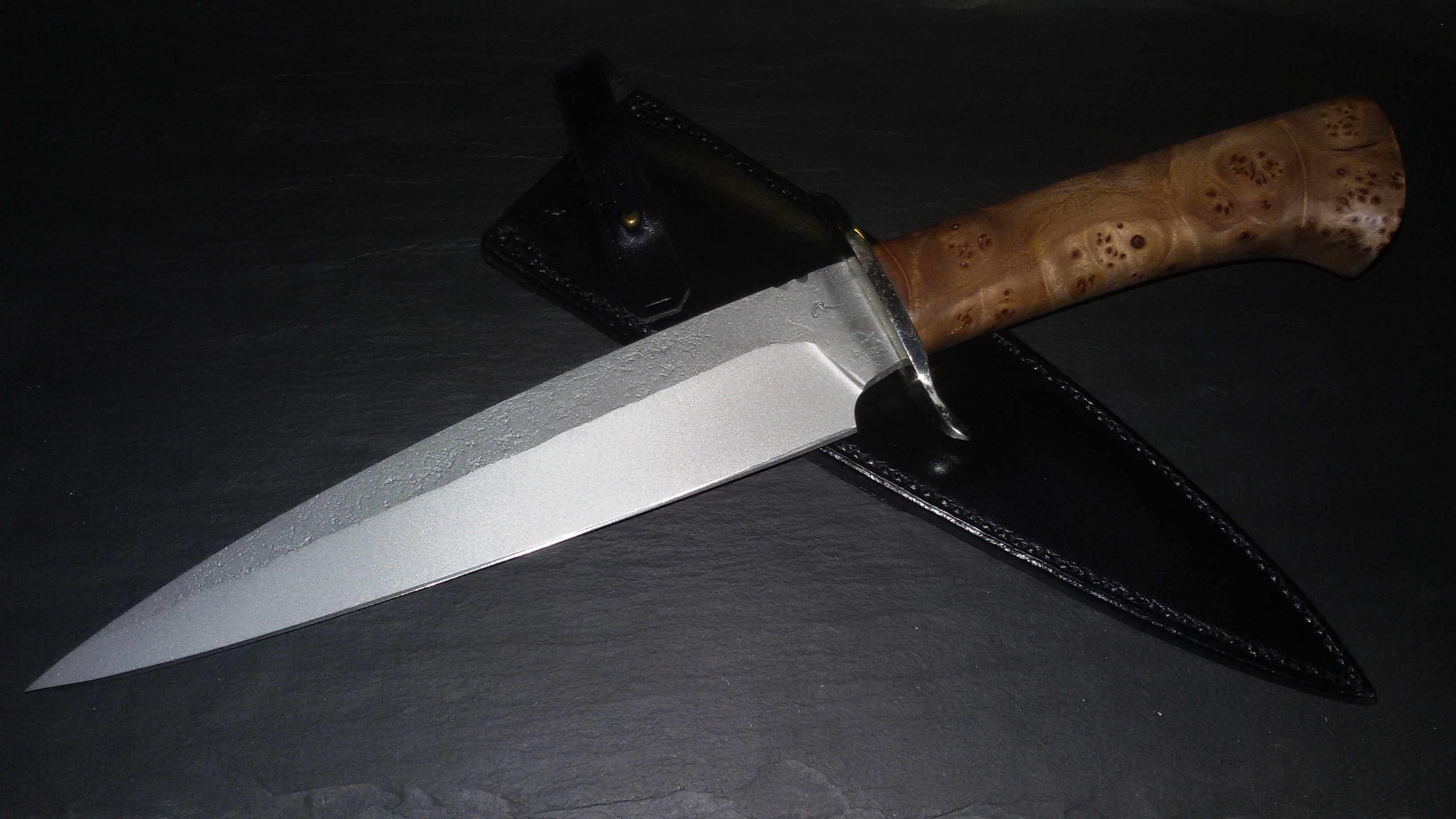 Couteau de chasse avec lame XC 75 de 215 mm forgée et sablée. Manche en Orme stabilisé et garde maillechort.