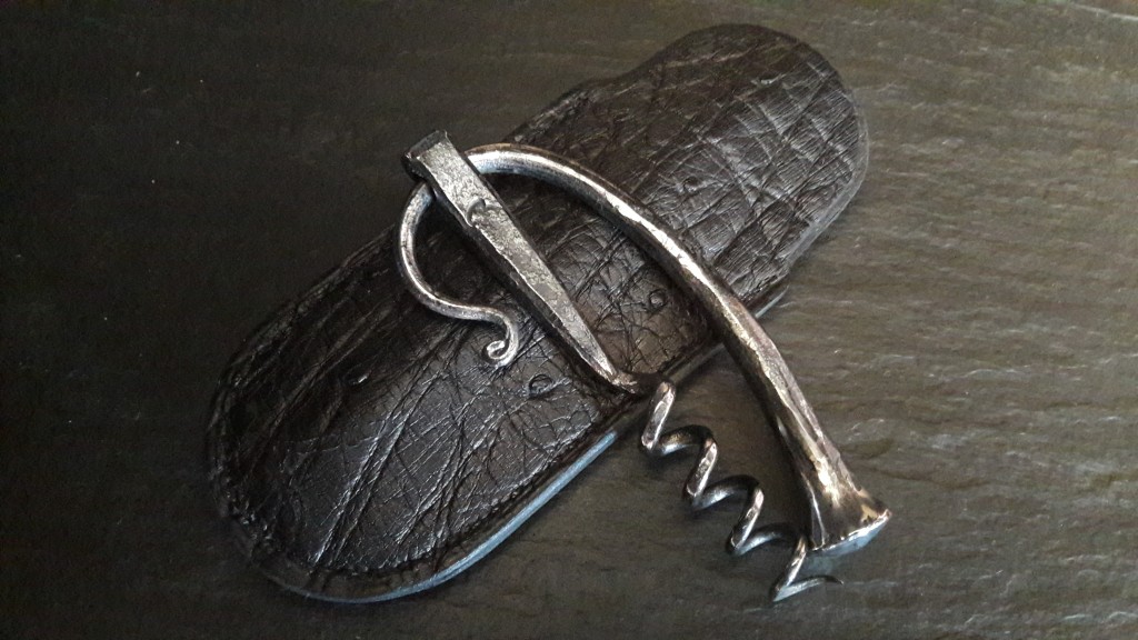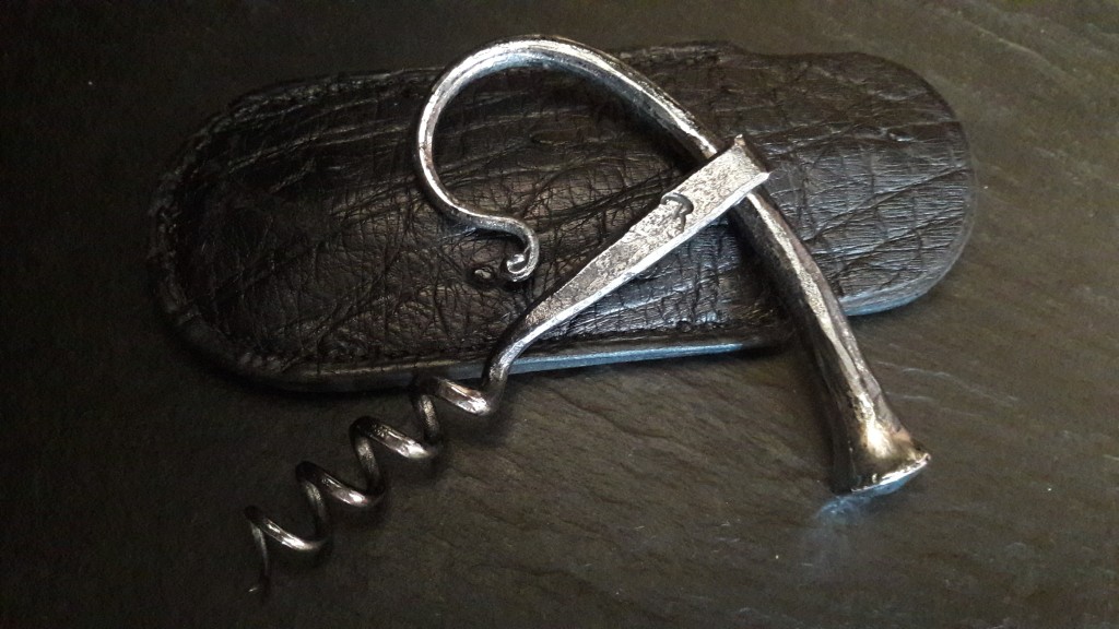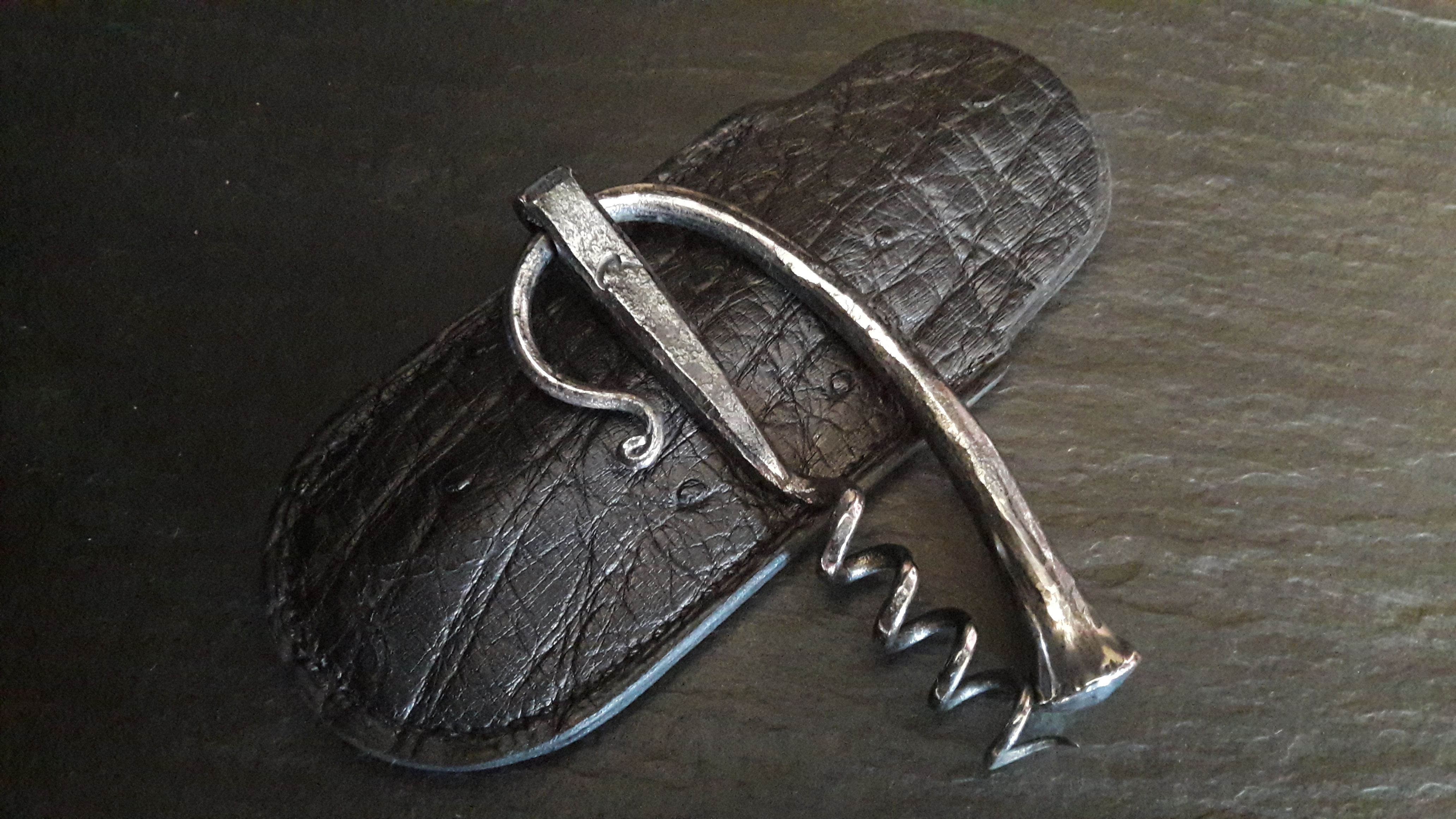 Tire Bouchon pliant de voyage avec son étui en Cuir d’autruche de chez Chantal Trocme .