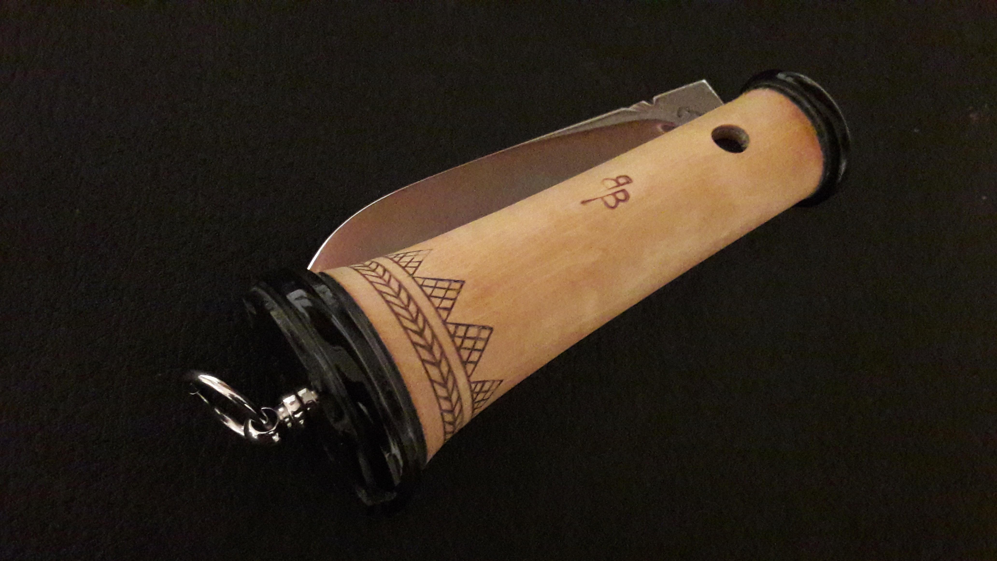Home » Cran plat » Le prototype « Sautivet » est terminé et c’est pas une mince affaire !!! Cran plat avec lame Xc75 et manche buis et corne de buffle. Ce manche est un véritable morceau de cornemuse récupéré chez un facteur de musette.