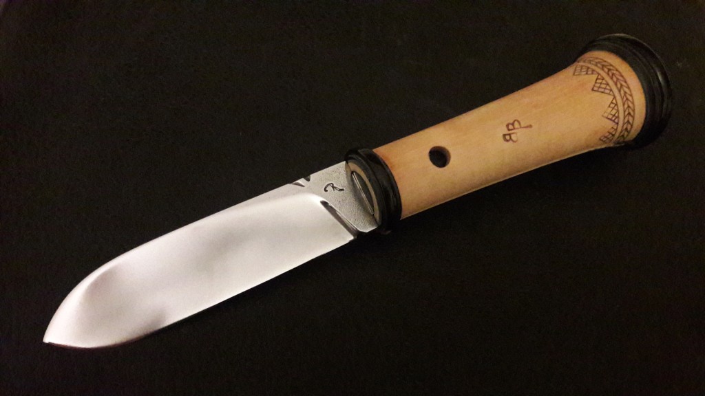 Le prototype « Sautivet » est terminé et c’est pas une mince affaire !!! Cran plat avec lame Xc75 et manche buis et corne de buffle. Ce manche est un véritable morceau de cornemuse récupéré chez un facteur de musette.