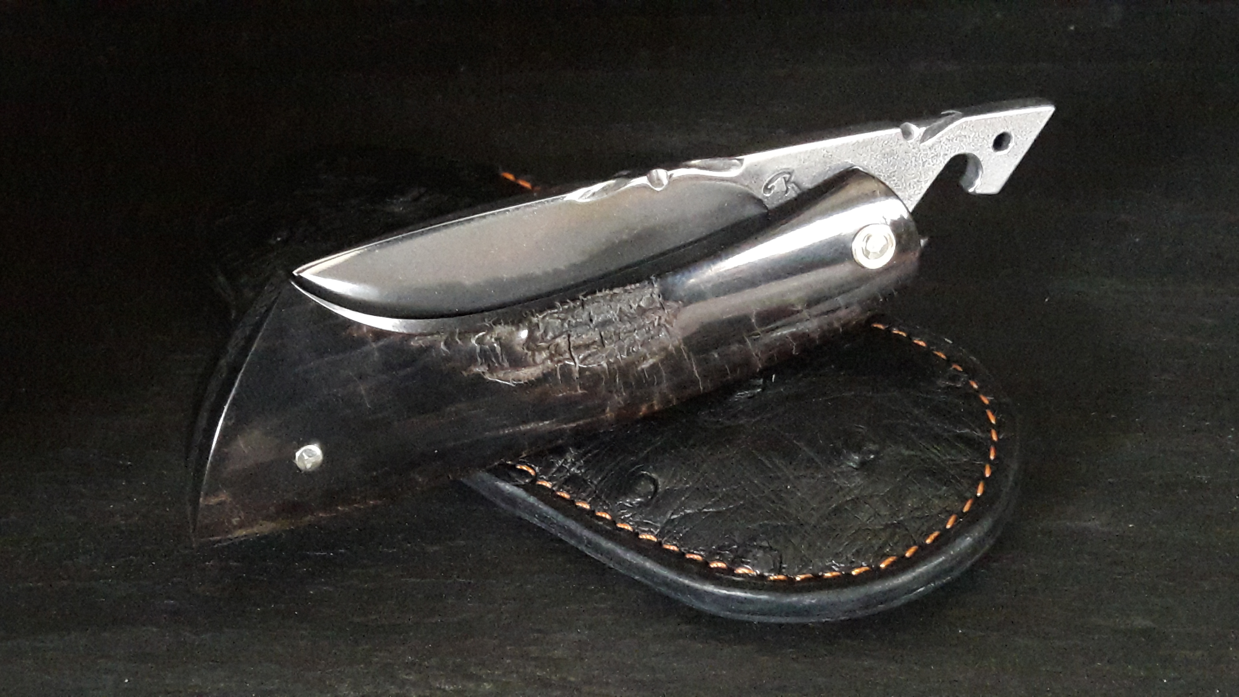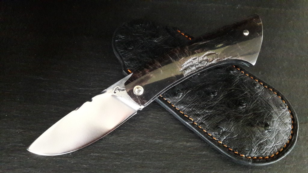Requin Mousse avec lame en Xc75 de 4mm et manche buffle d’Afrique . L’étui en cuir d’Autruche est de Chantal Trocme.Vendu.