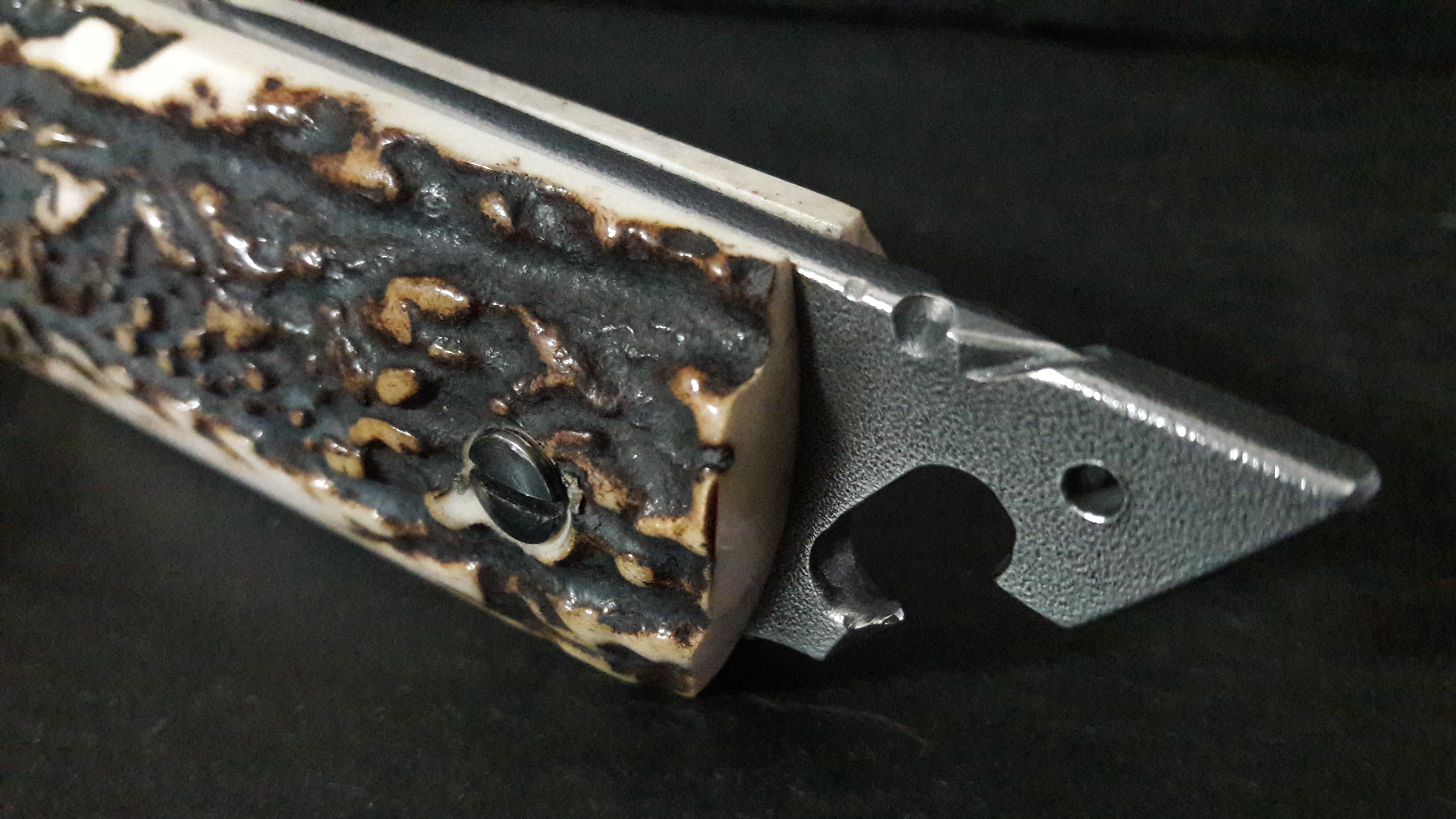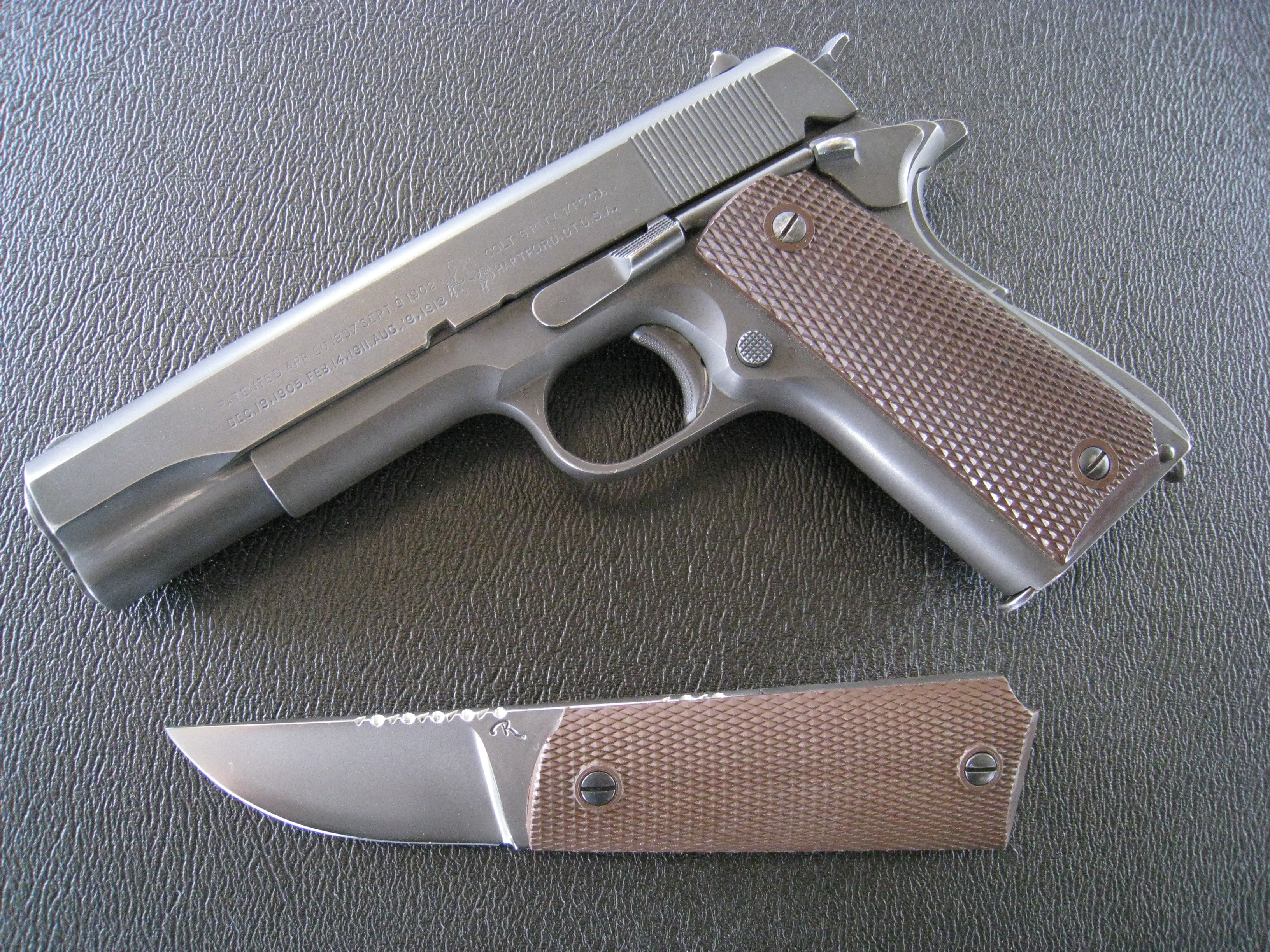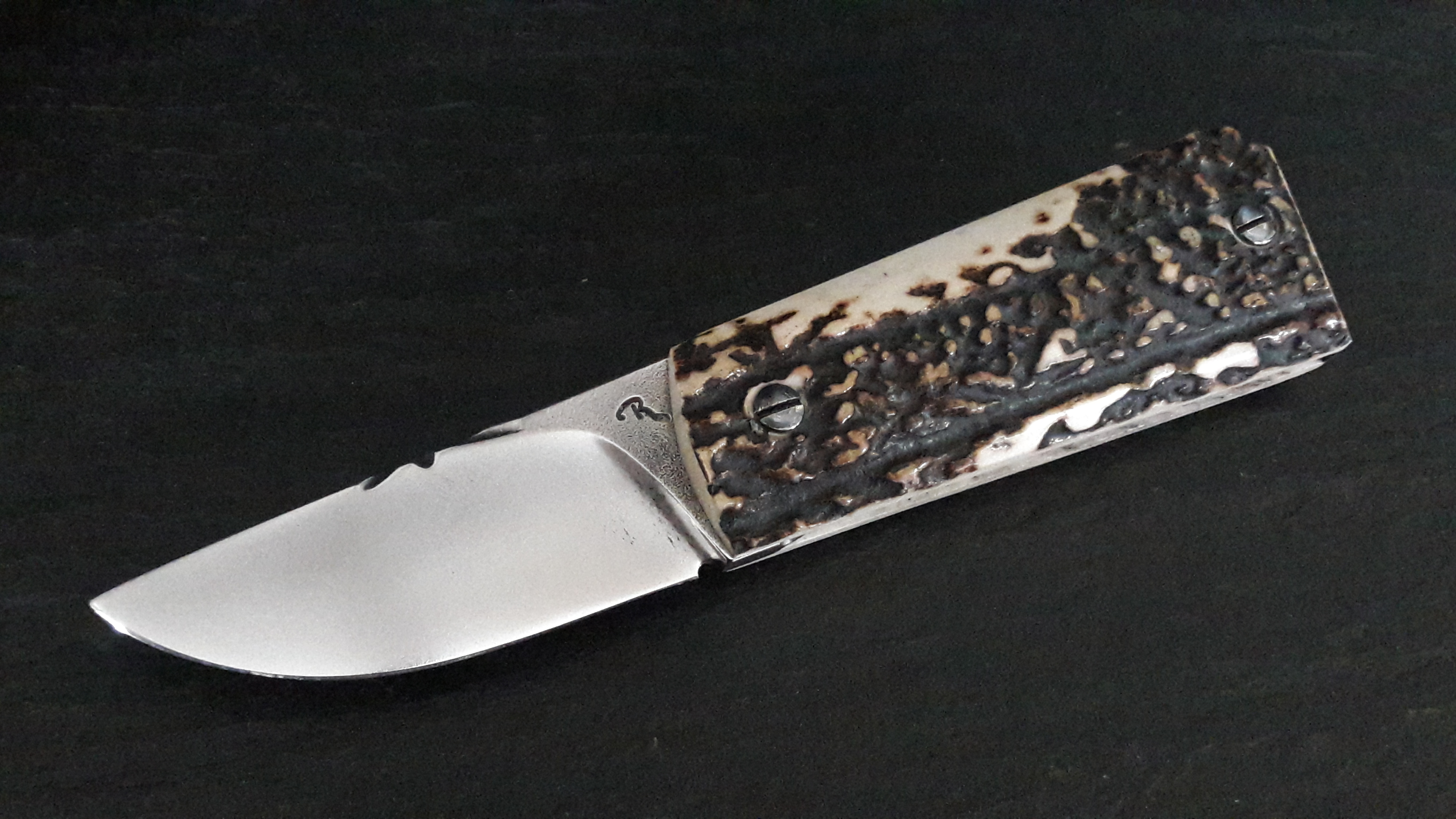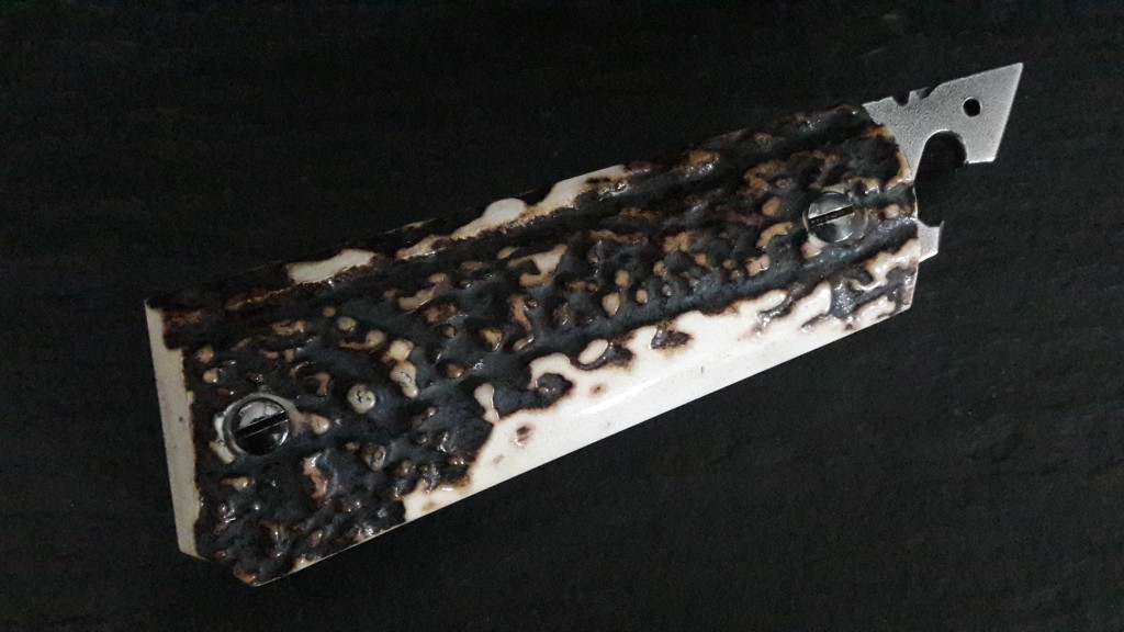 Le « Onze » Requin Mousse avec plaquettes de Colt 1911 en bois de cerf et lame Xc 75. Vendu.