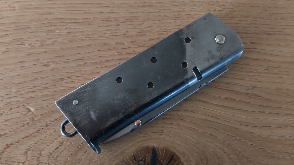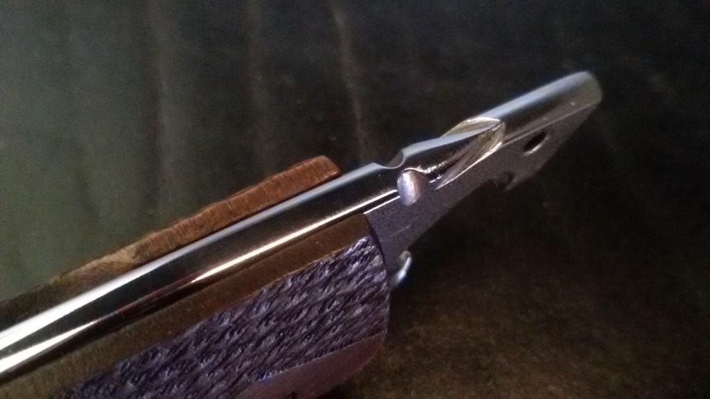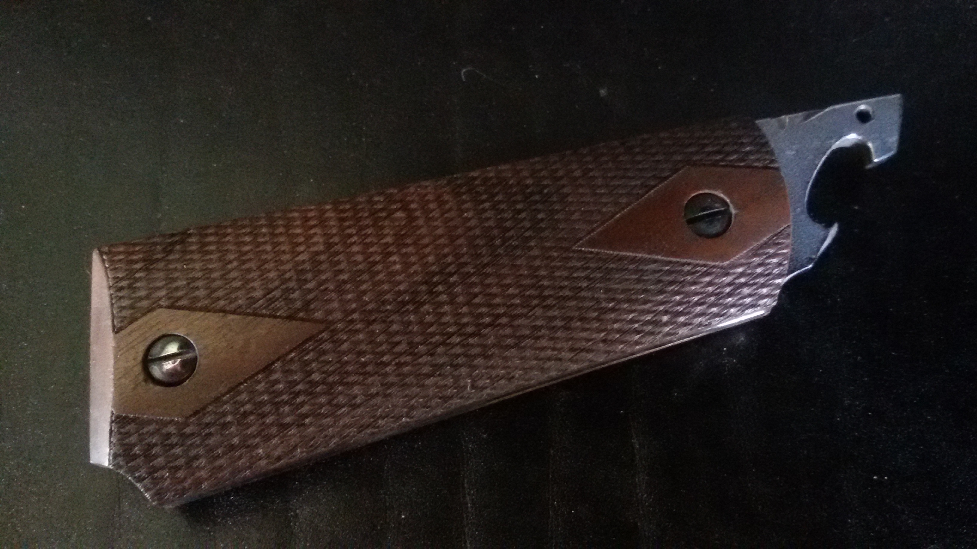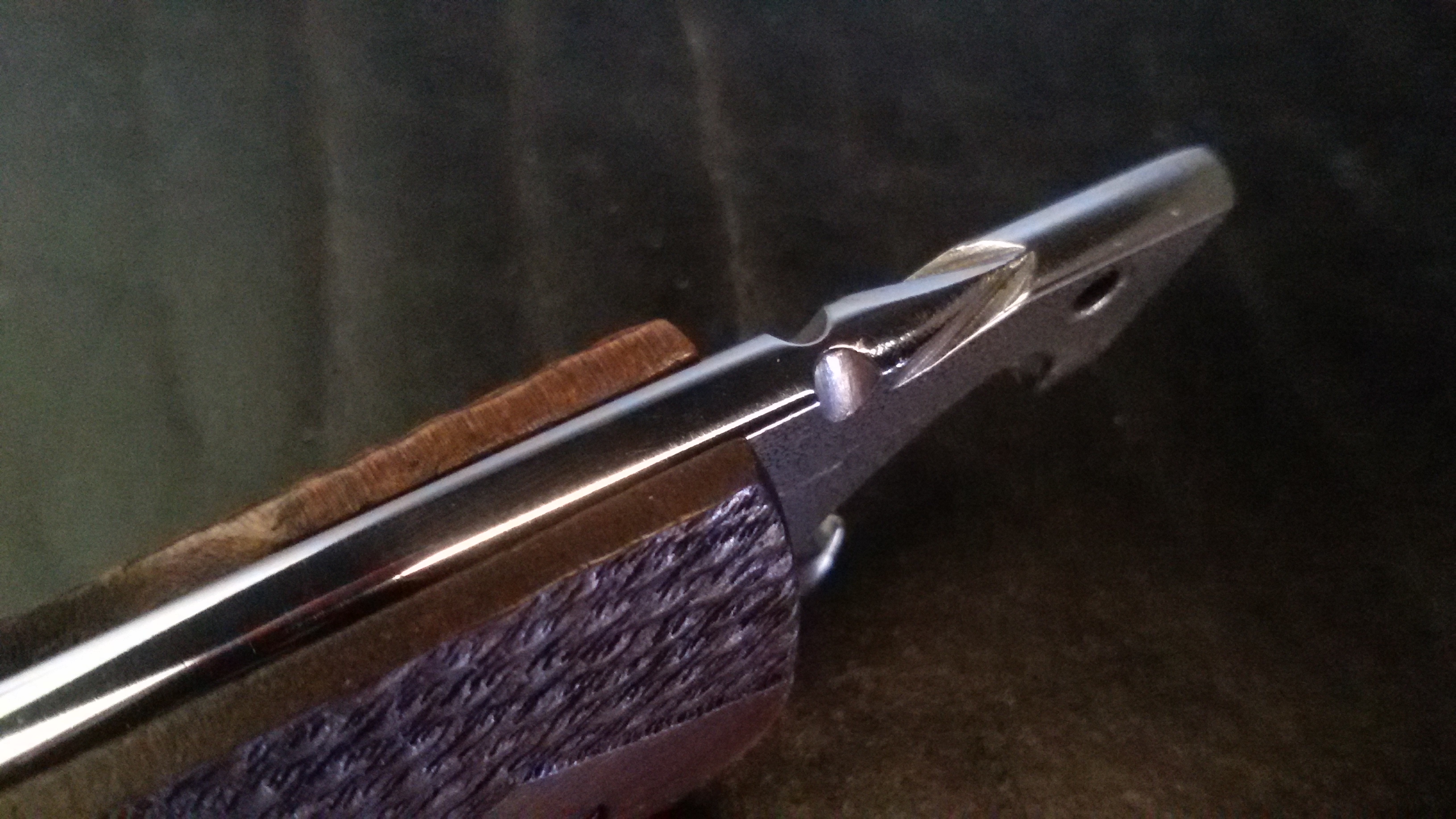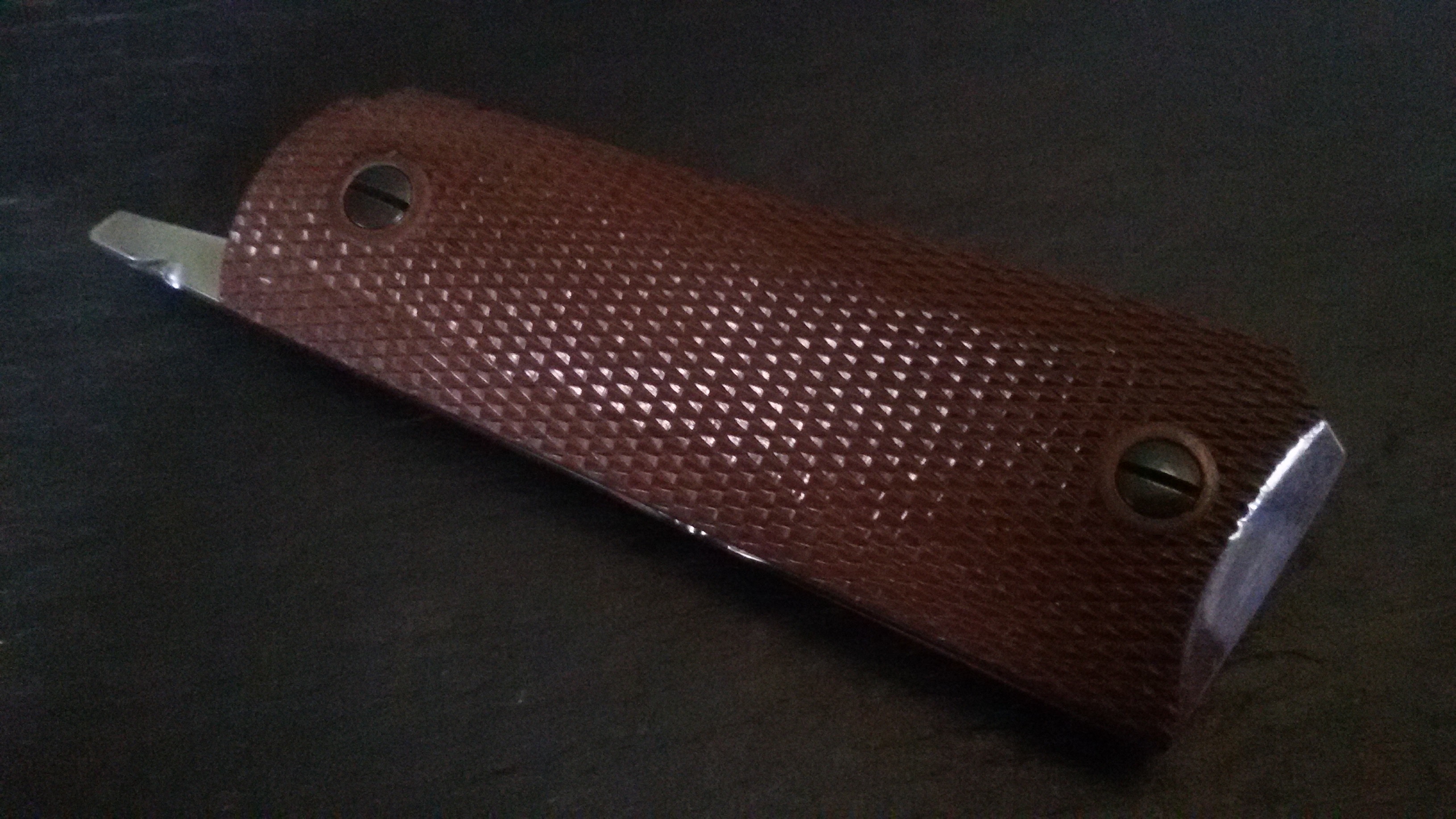 Le « Onze » Requin Mousse avec plaquettes de Colt 1911 en bois de cerf et lame Xc 75. Vendu.