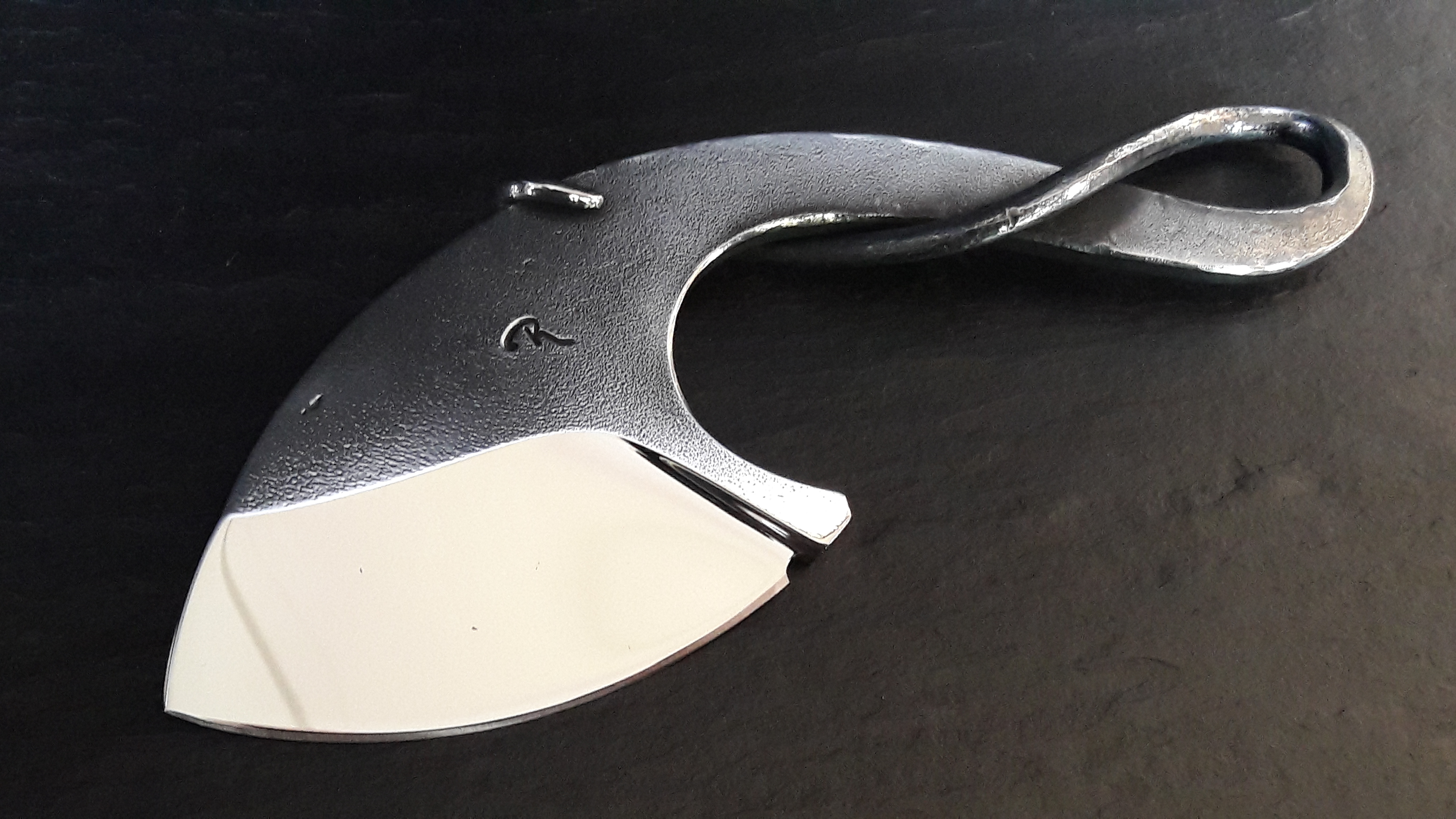 Requin Mousse avec lame en Xc75 de 4mm et manche buffle d’Afrique . L’étui en cuir d’Autruche est de Chantal Trocme.Vendu.