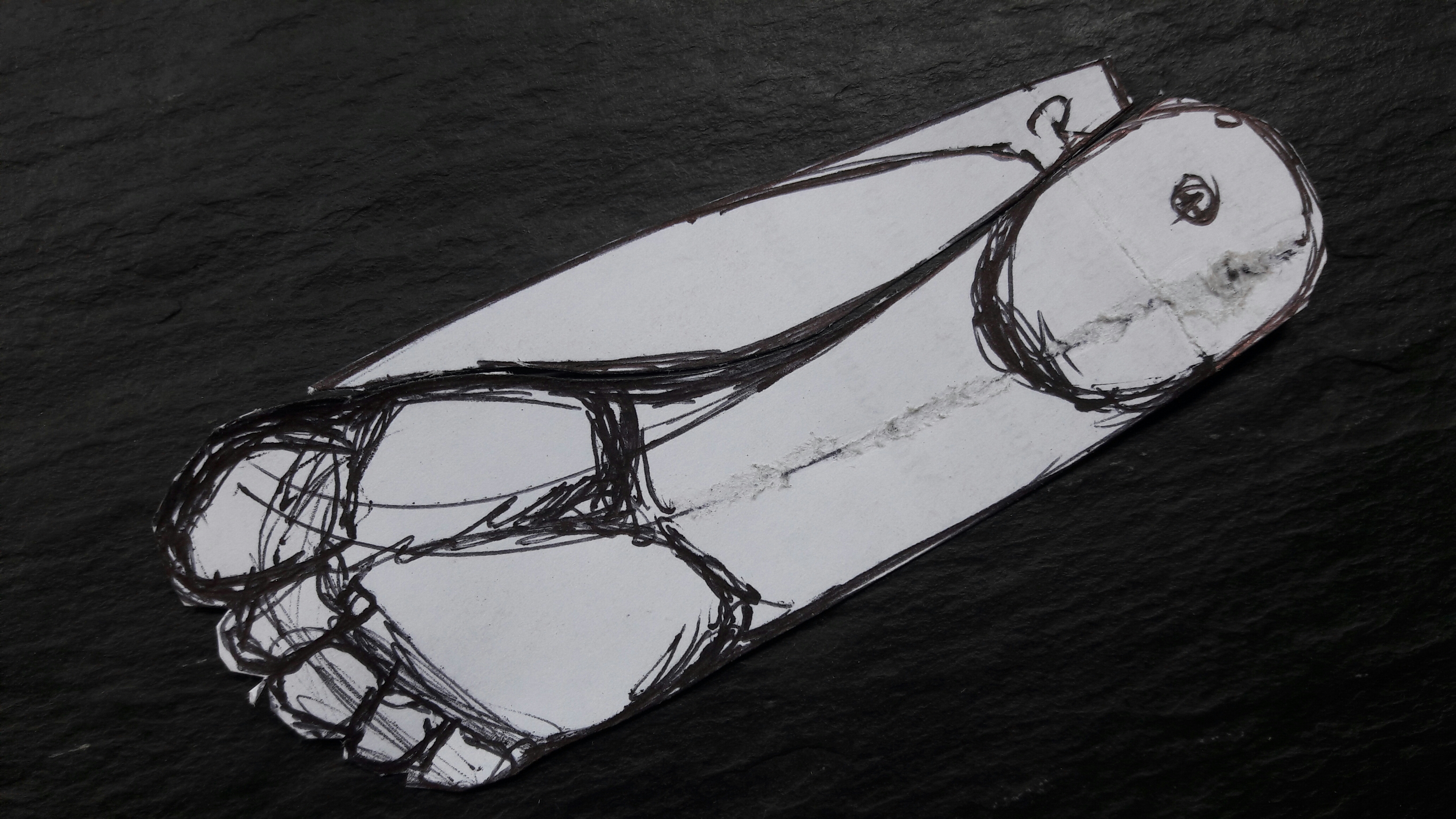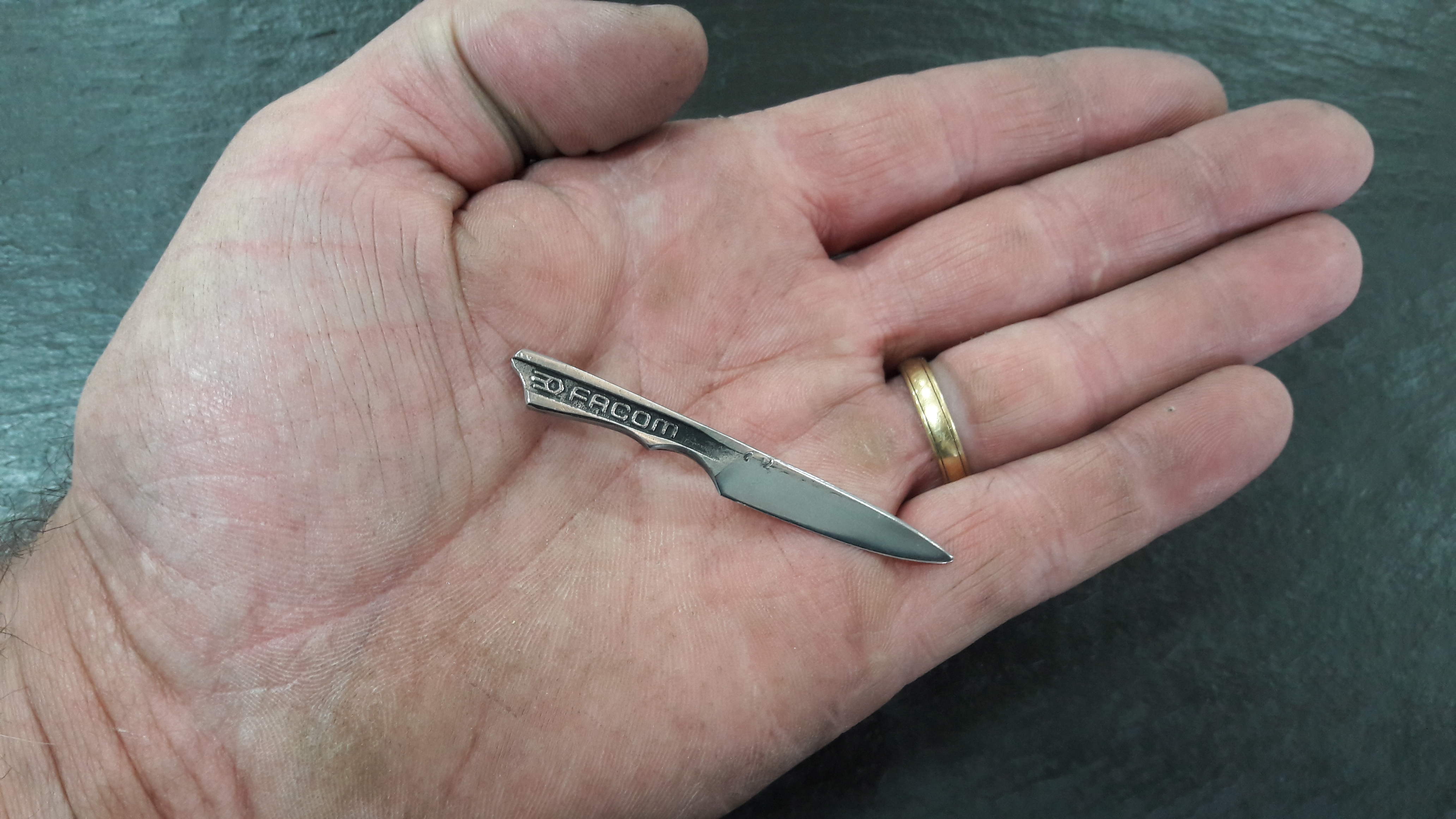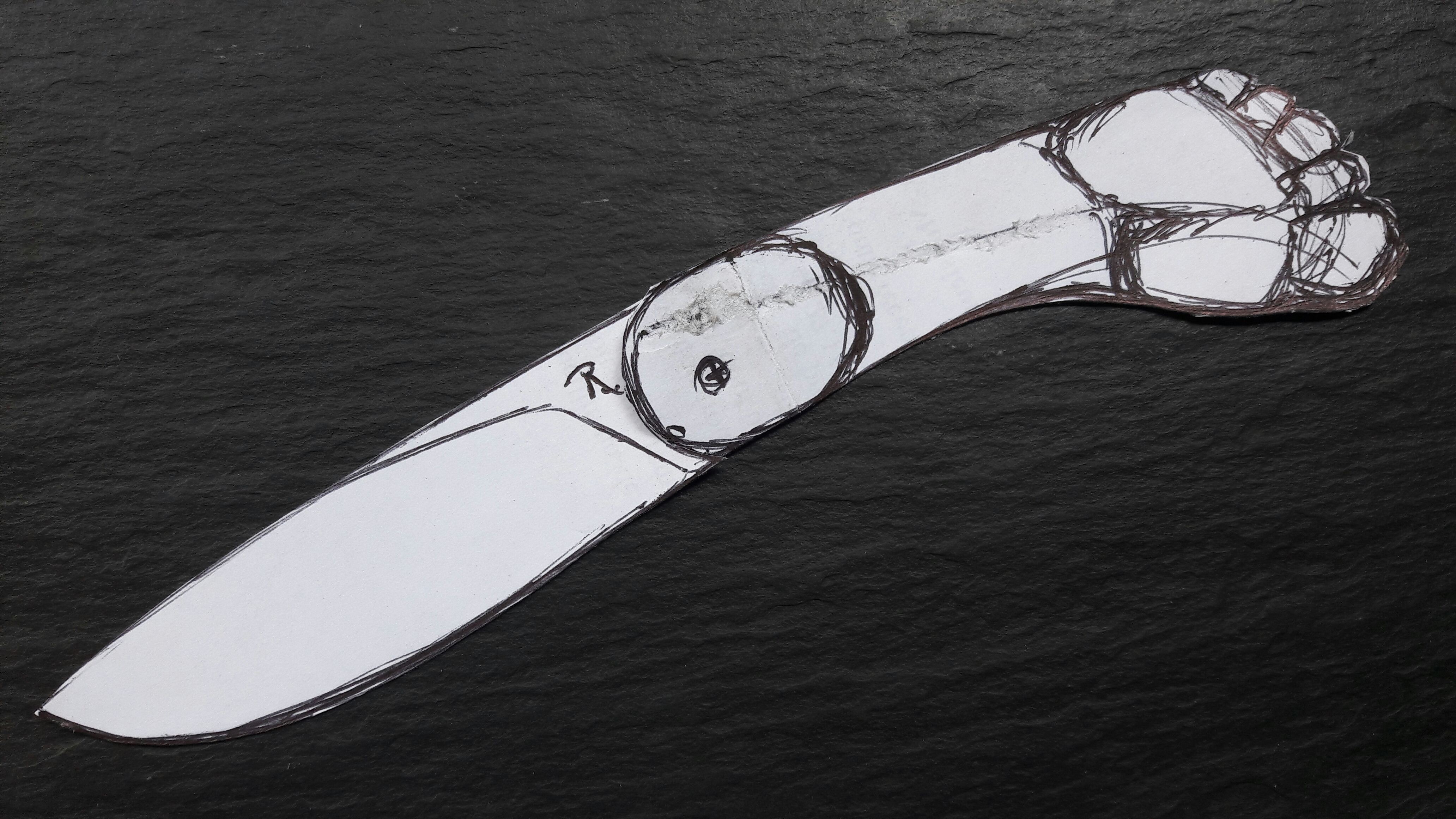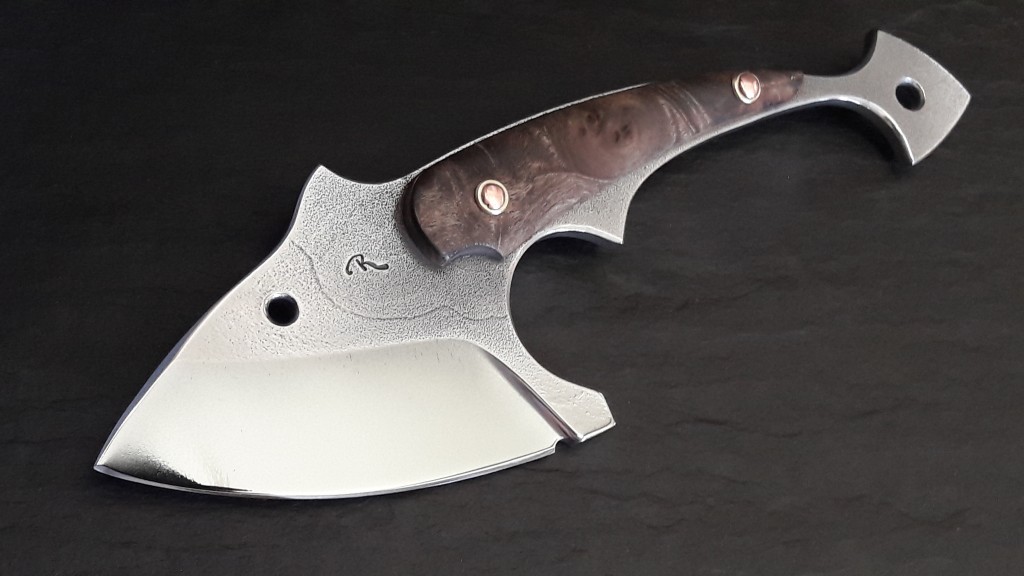 Requin Mousse avec lame en Damas de chez Thierry Desnoix avec manche fibre de carbone structuré. Vendu.