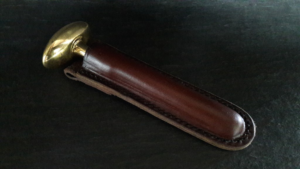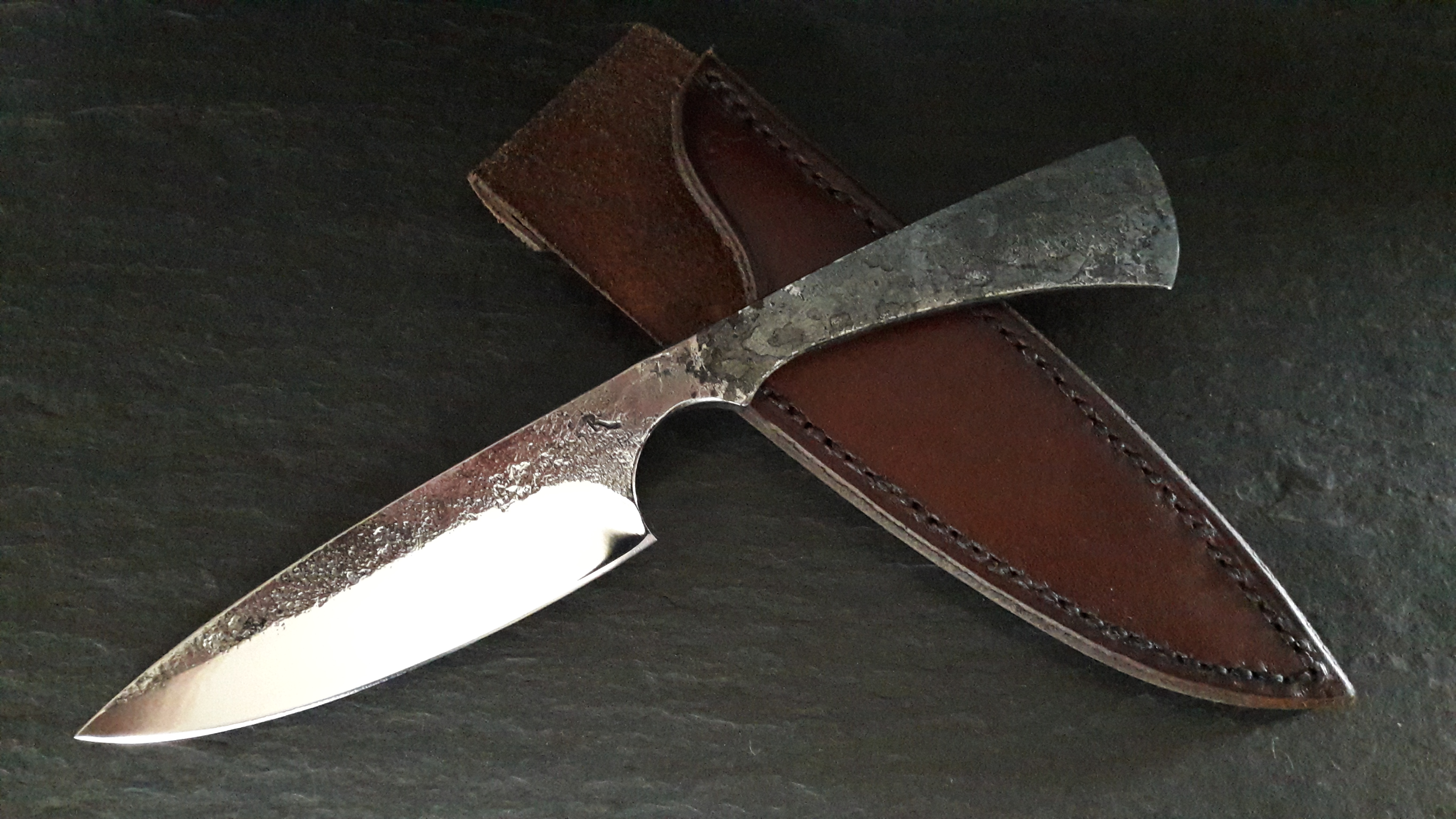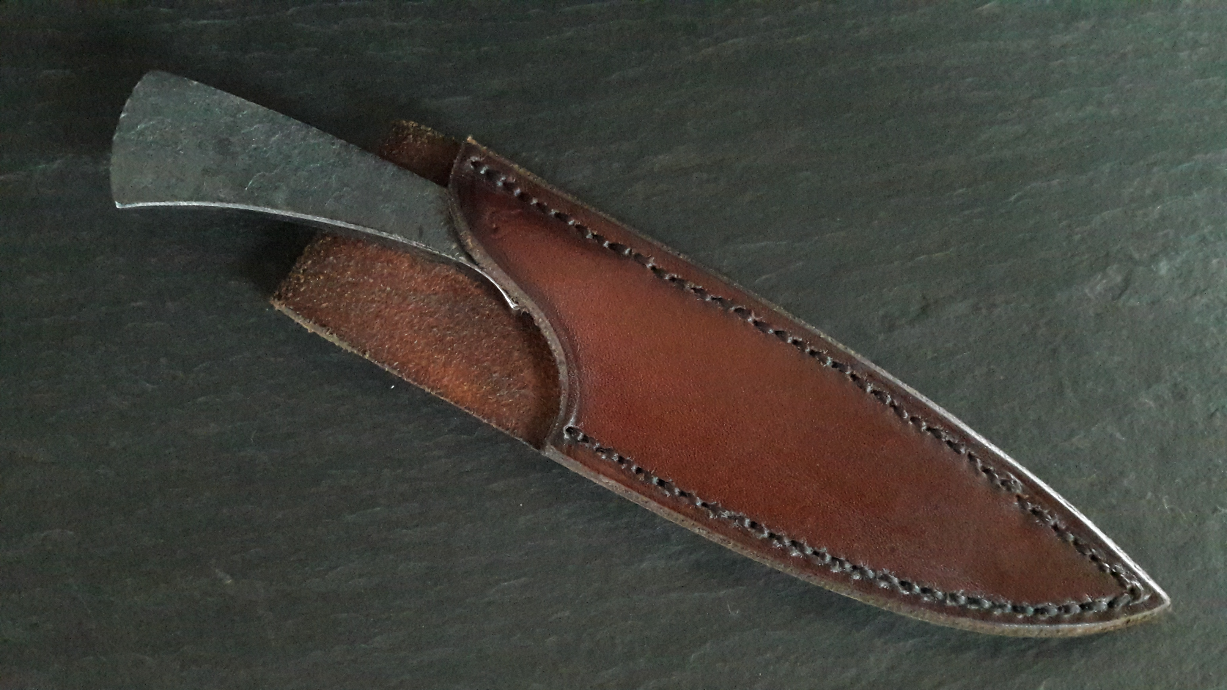 Couteau Cran plat avec lame en C100 de 3 mm x 85 mm et plaquettes fibre de carbone structuré. L’étui en cuir est de Bertrand Montillet.