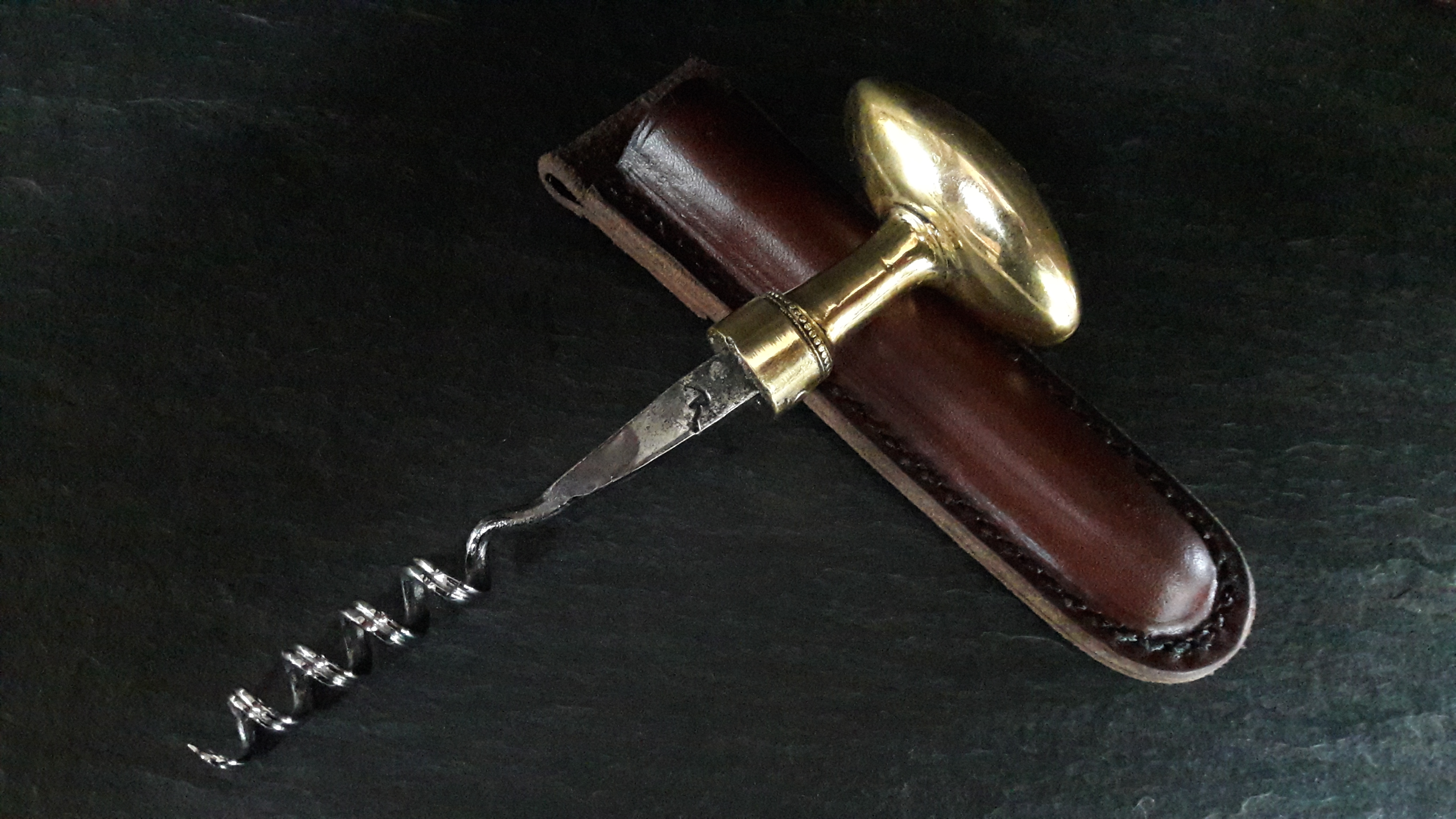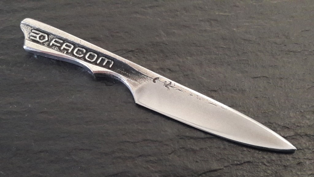 Petit Cran plat avec lame 70 mm damas torsade de Jean Michel et plaquettes fibre de carbone structuré. L’étui en cuir est de Chantal Trocme.Vendu.