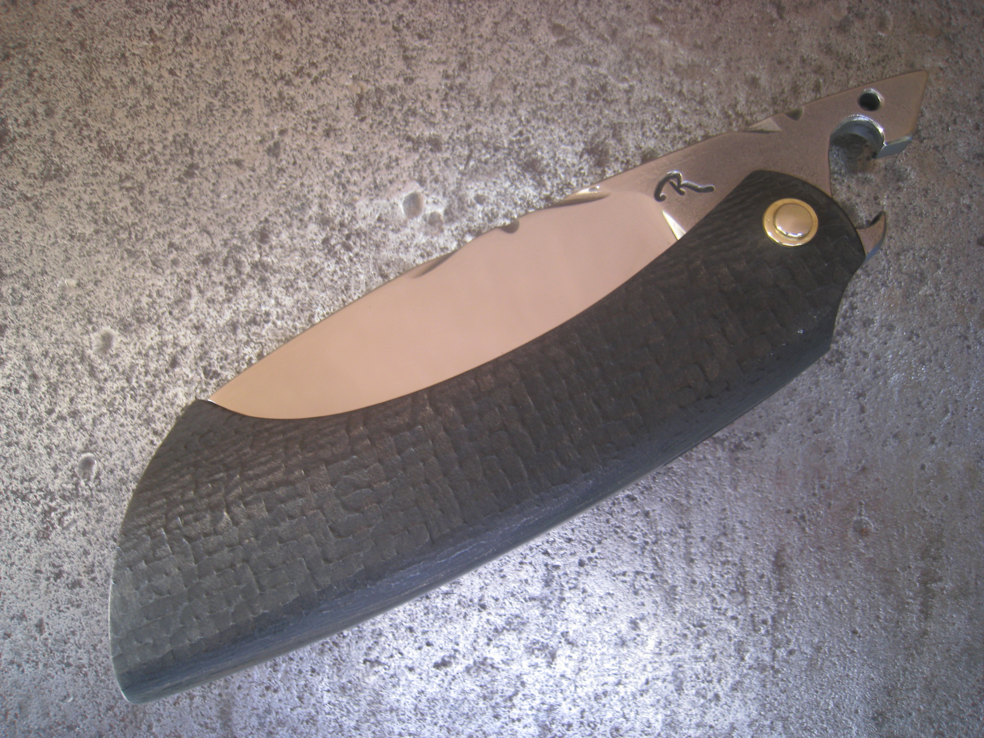 Chasse avec lame forgée en Xc75 de 130 mm, manche en bois de Cerf et garde en inox structuré.300 Euros.
